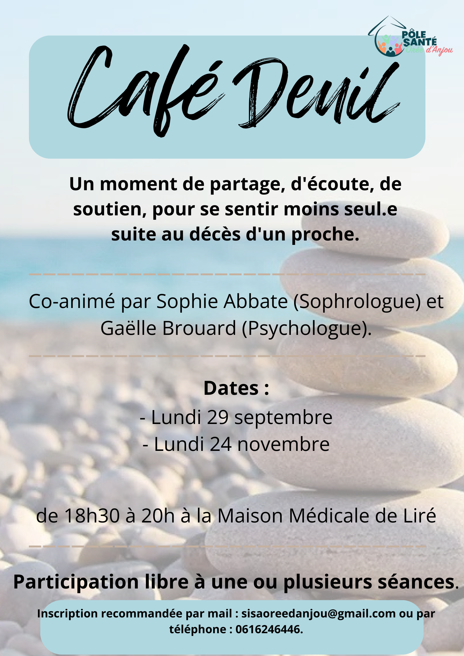 Parce qu’on ne devrait pas traverser le deuil seul(e)… Nous vous proposons un moment de partage, d’écoute et de soutien, ouvert à toutes celles et ceux qui ont perdu un proche. Un espace bienveillant pour parler, se souvenir, ou simplement être là… ensemble. Maison médicale de Liré Lundi 29 septembre et Lundi 24 novembre de