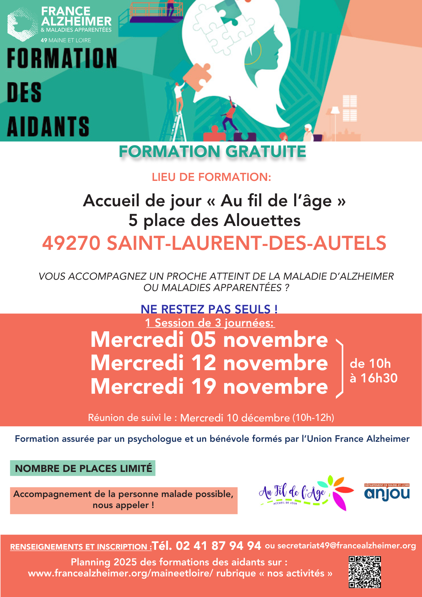 France Alzheimer Maine-et-Loire vous propose une formation gratuite à destination des proches aidants accompagnant une personne atteinte de la maladie d’Alzheimer ou d’une maladie apparentée. 📅 Dates de la session : Mercredi 5 novembre 2025Mercredi 12 novembre 2025Mercredi 19 novembre 2025 🕒 Horaires : de 10h00 à 16h30 💬 Réunion de suivi : Mercredi 10